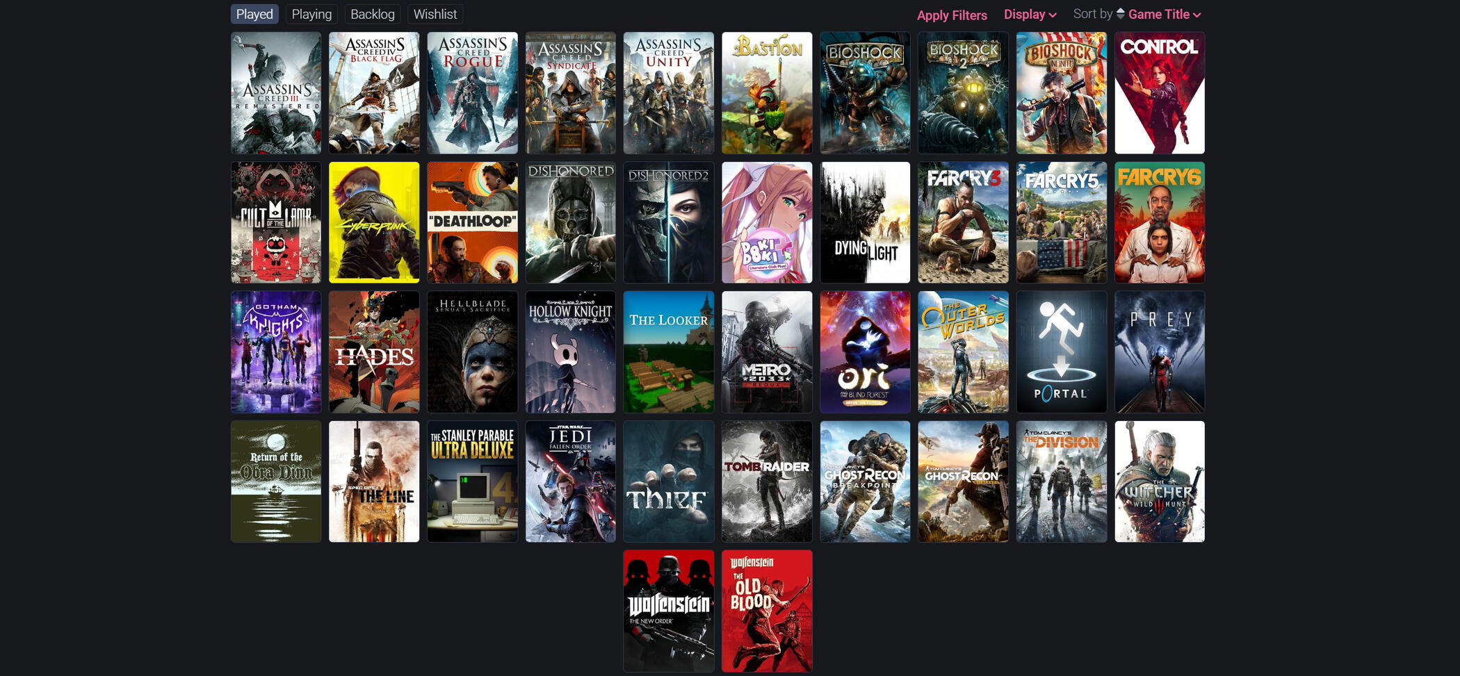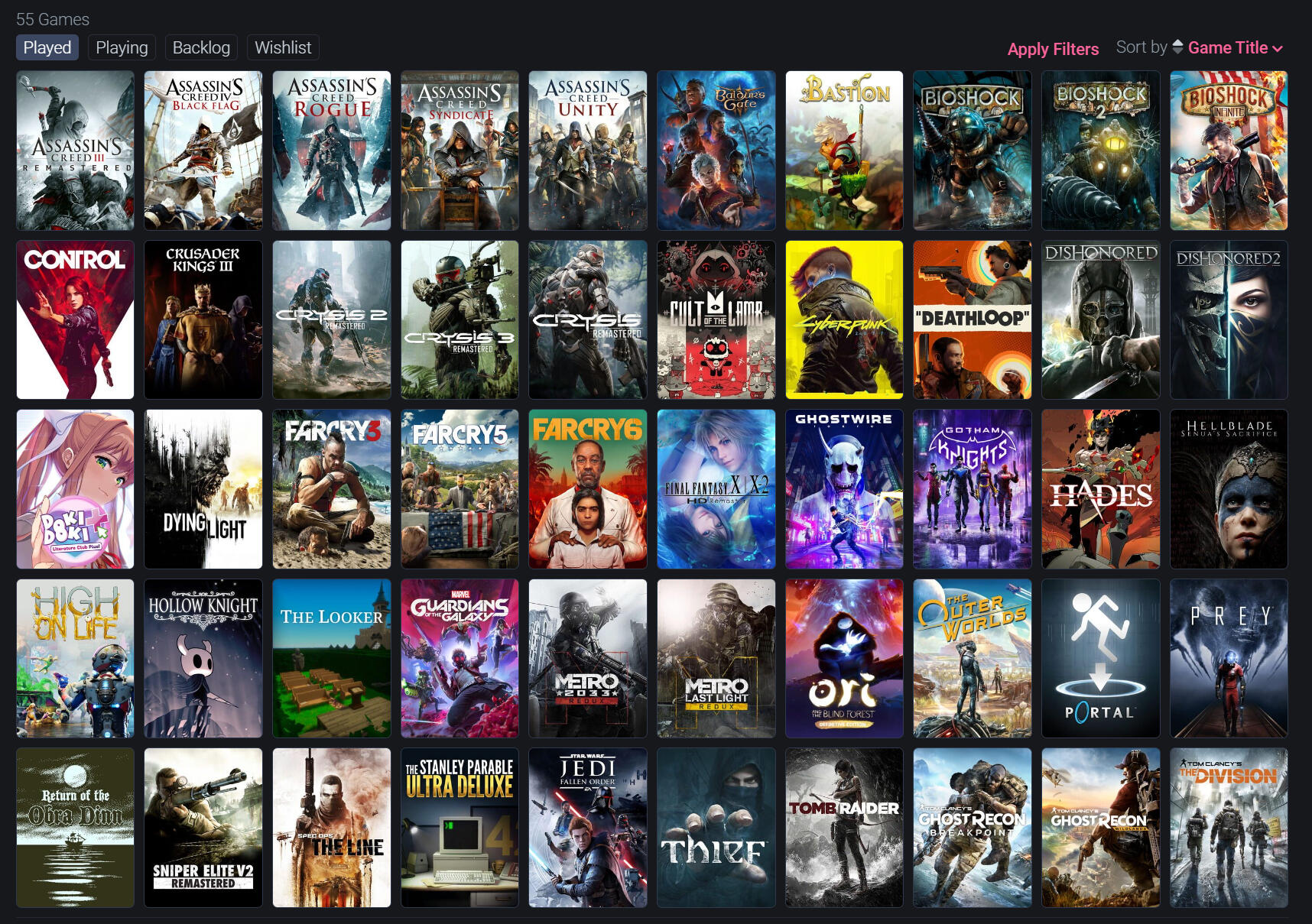 Easy enough, even if not entirely quantifiable -- although I did decide early to differentiate between "finishing" and "completing" (i.e., 100%) for the sake of my own sanity. I also eventually found myself paying attention to other elements like level design (e.g., Deathloop) and score (e.g., Hades, Wolfenstein: The New Order) and decided to keep those in mind as loose subsets of the first goal.And, overall, I think I was fairly successful. There were a few rough ones, most of which I'll get to below, but after years of pretty much never finishing any games, I'm pretty happy with the final stats: